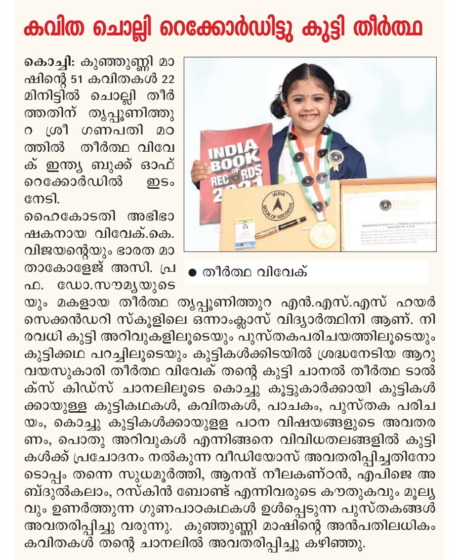 Theertha is a young poetry prodigy who has set multiple records, including the International Book of Records, India Book of Records, and Asia Book of Records. She has written and recited 27 poems in Malayalam, English, and Hindi, making poetry more engaging for children through illustrations and videos.